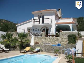 Beautiful country house in a prime location in Monefrio Granada which has amazing views in a relaxing spot. This wonderful property has 4 large bedrooms, 2 bathrooms, a living room, sitting room with fireplace, 2 fully fitted kitchens, one of them next to the 10.0 x 4.0 sqM pool area. It is full of character and the many terraces around the property are dressed with plants and all with stunning views. There is a garage with room enough for 7 cars. The outside space has 6,000 sqM with 70 producing olive trees.It is sold furnished. This is a very special property and they do not come available very often.